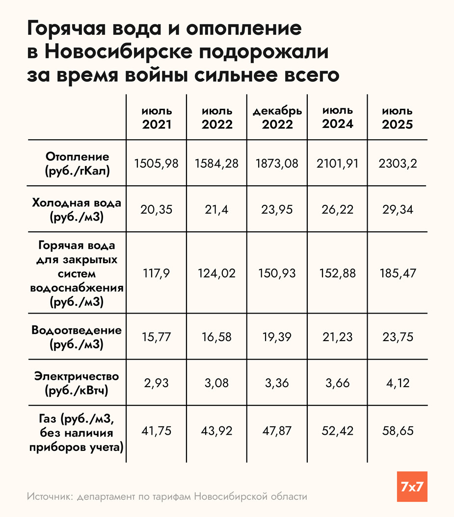 Коммунальные услуги в России за время полномасштабной войны с Украиной подорожали в среднем на 39%, согласно подсчетам «7х7». Власти оправдали это будущей модернизацией коммунальной инфраструктуры и инфляцией. Но причин больше — и они связаны с войной. Объясняем на примере Новосибирской области.