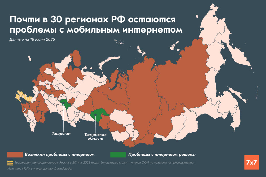 В Тюменской области перебои длились неделю, с 12 по 18 июня. Безналичная оплата в магазинах и такси не работала. Водители возили клиентов сначала к банкоматам, а уже потом — по нужному адресу. После 18 июня связь в регионе была восстановлена. Также на момент публикации мобильный интернет вернулся в Татарстане.