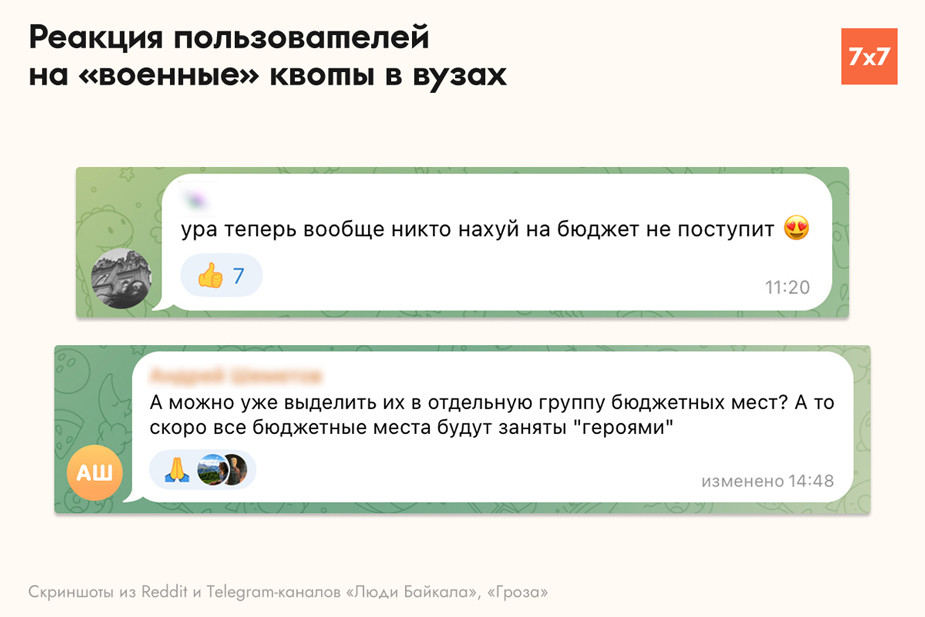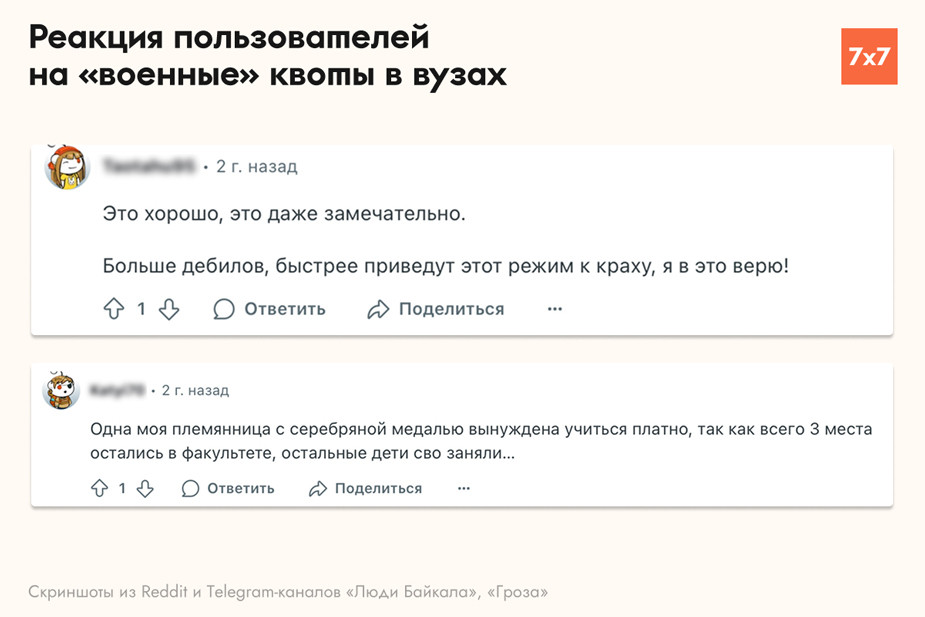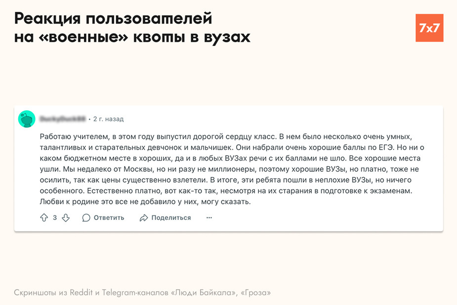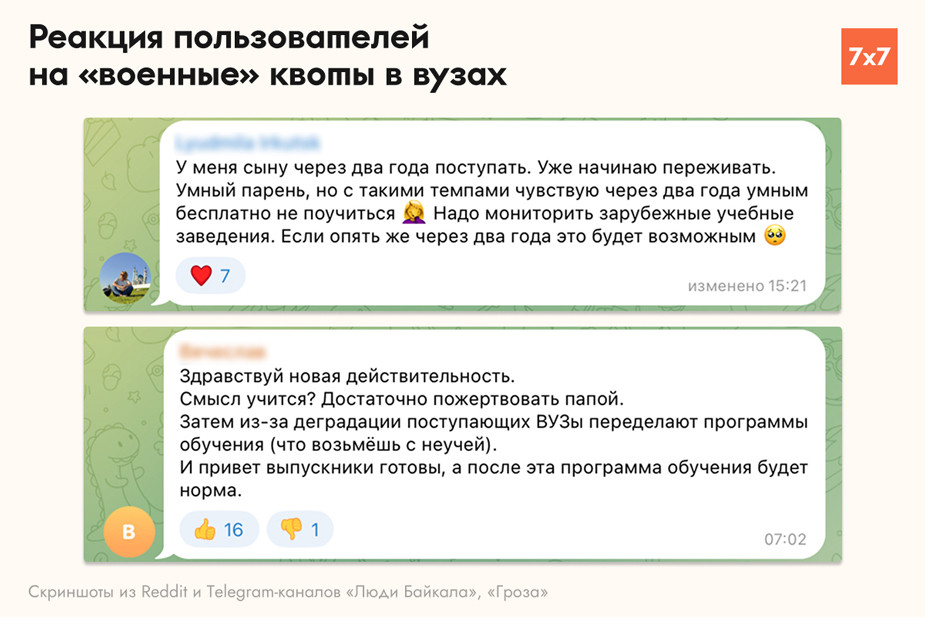 Социолог Даниил Александров отмечал, что дети военных часто подают документы на программы, с которыми заведомо не смогут справиться. Преподаватели ставят им тройки вместо двоек из страха - вдруг студент примет неуд за дискриминацию семей военных и пожалуется в администрацию вуза. Такие привилегии могут демотивировать остальных учащихся.