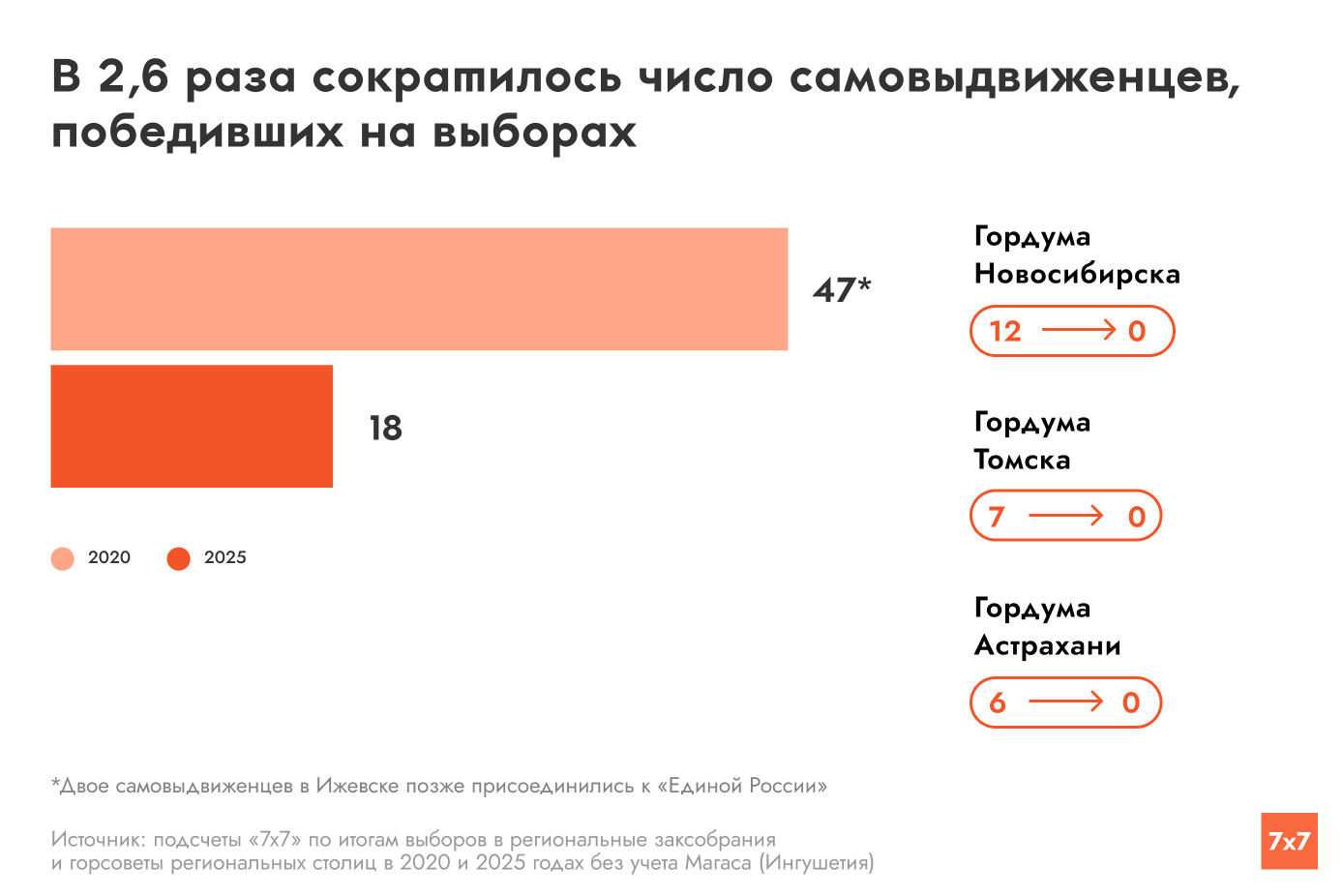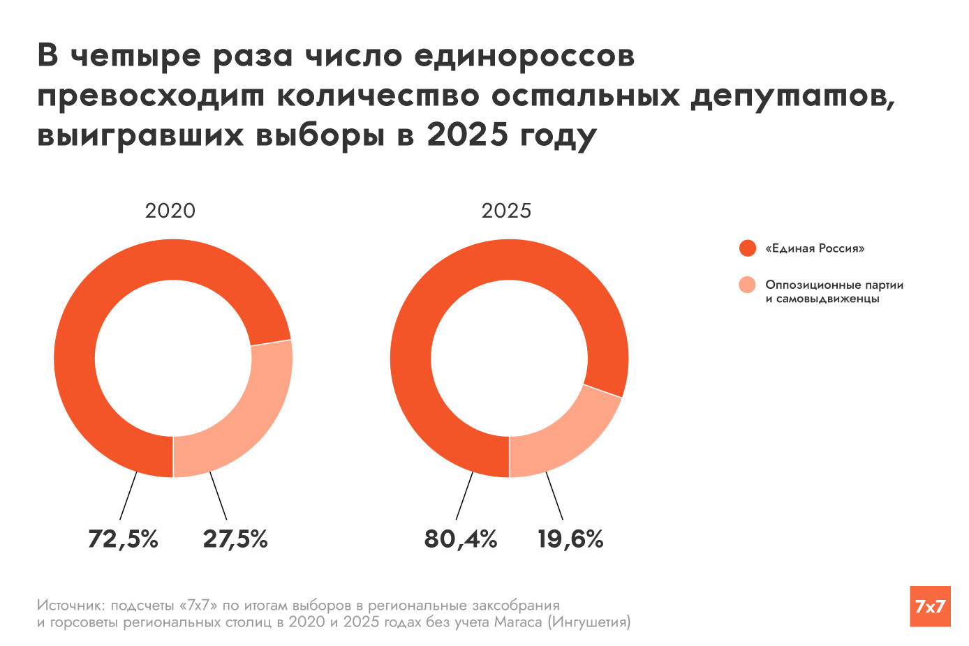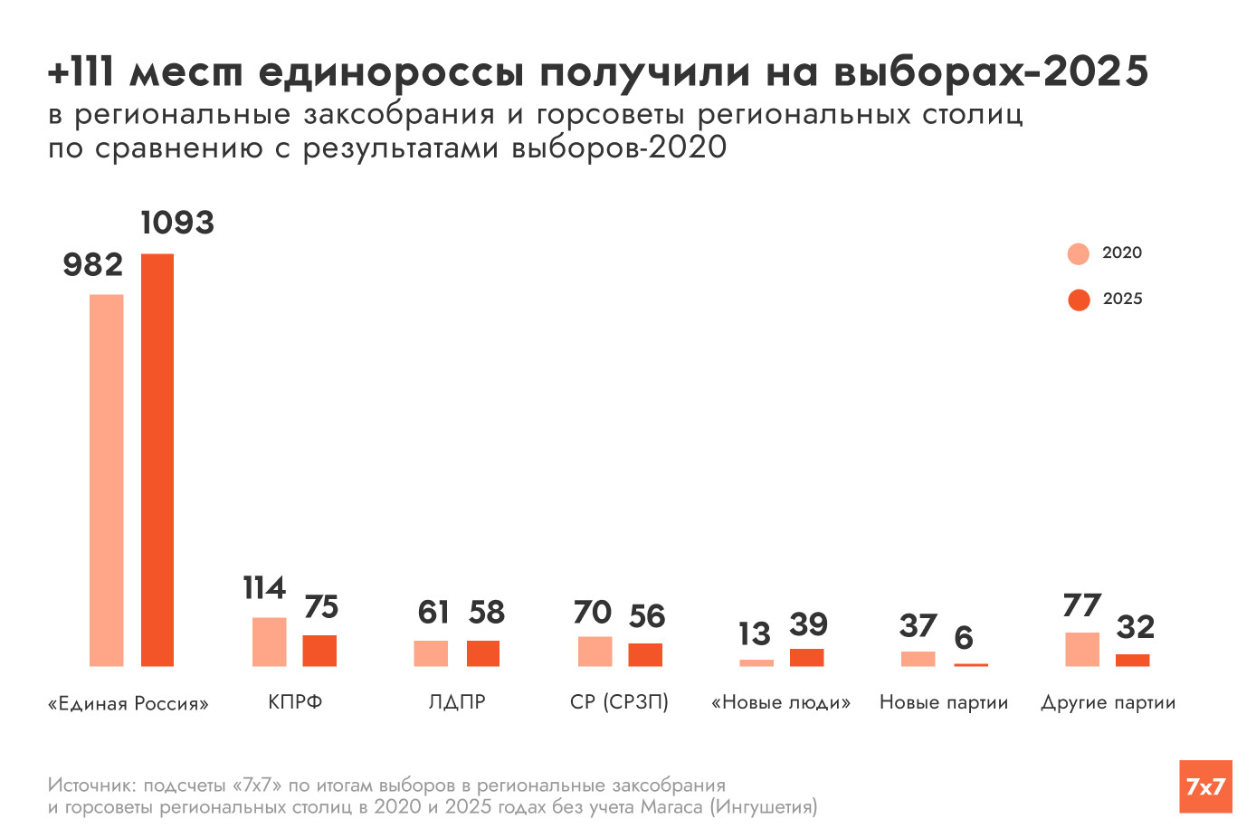 «Единая Россия» взяла под контроль заксобрания 11 субъектов федерации и городские советы в 24 столицах регионов, где прошли выборы в сентябре 2025 года. Победе единороссов предшествовали новости о недопуске популярных среди избирателей оппозиционных кандидатов, о скупке голосов, принуждении к дистанционному электронному голосованию, подозрительно активном надомном голосовании и прессинге наблюдателей. Журналисты «7х7» подсчитали результаты «ЕР» и сравнили их с данными аналогичных кампаний 2020 года.