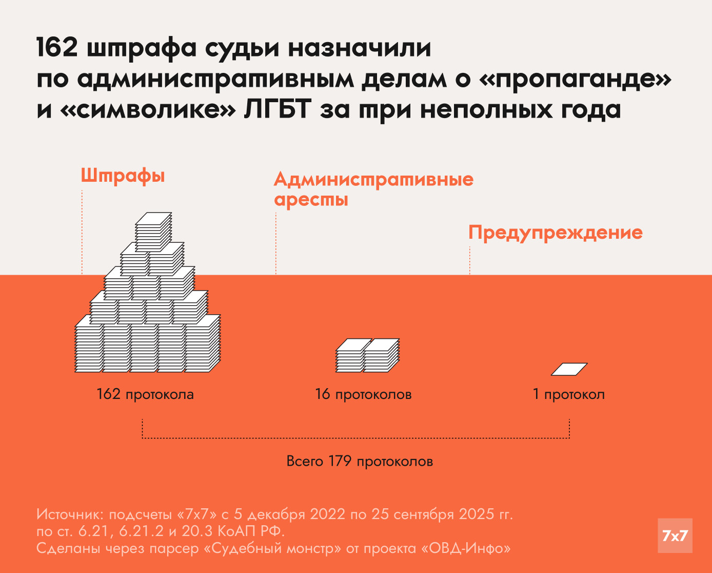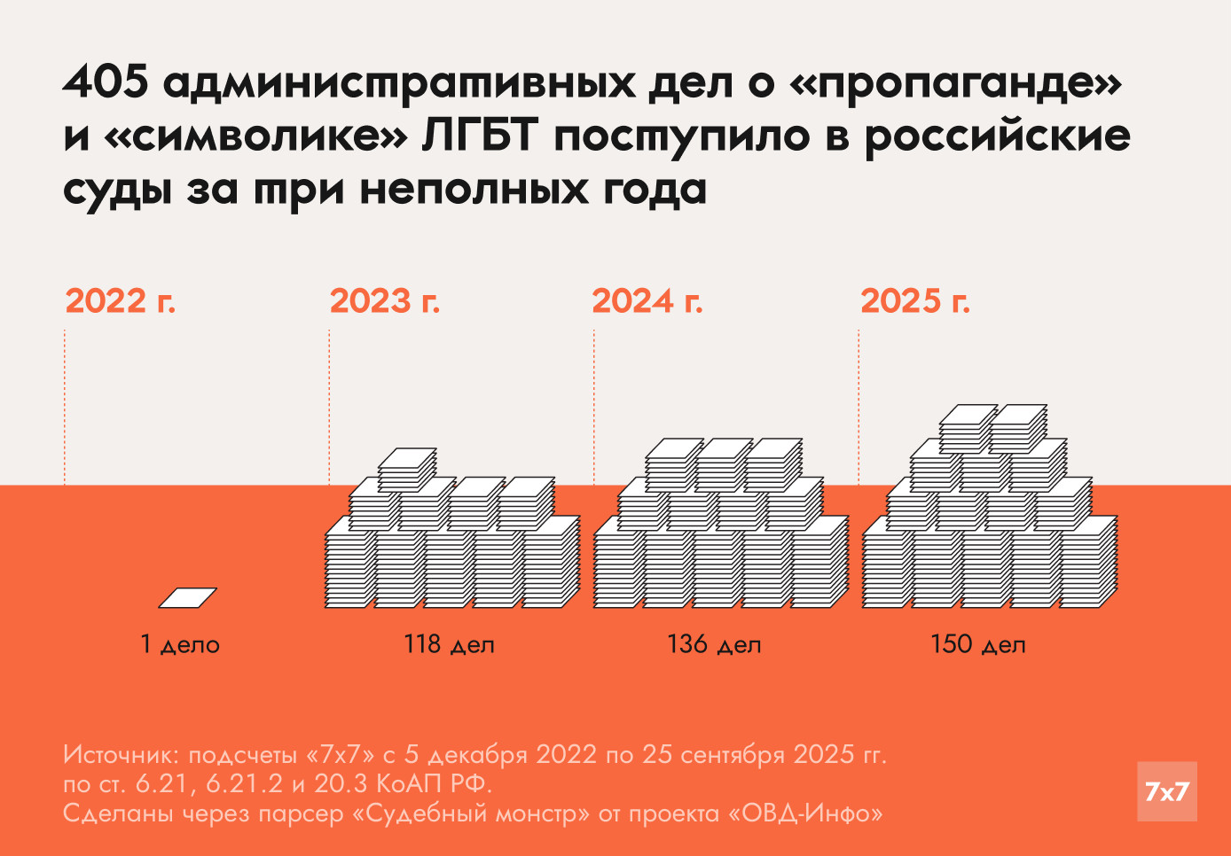 Редакция «7х7» проанализировала, как с момента принятия закона о полном запрете «ЛГБТ-пропаганды» власть преследует россиян по двум специализированным статьям КоАП: 6.21 и 6.21.2, и по статье 20.3 КоАП РФ о пропаганде или публичной демонстрации запрещенной символики. Информация в подсчетах может быть неполной, так как некоторые суды выкладывают данные с задержкой или не публикуют их полностью, плюс использованный парсер ищет данные не по всем судам (например, он не берет информацию с сайтов мировых судов).