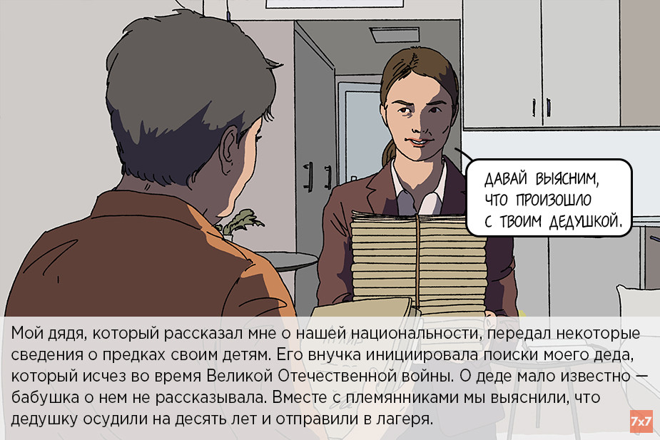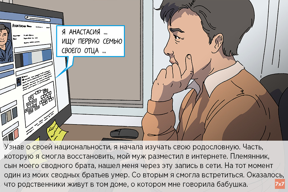 В 40 лет Анастасия узнала, что она еврейка. Ее родители и близкие родственники замалчивали информацию о национальности — они не хотели попасть под репрессии или столкнуться с неприязнью окружающих. Когда Анастасия узнала о своем происхождении, она начала искать родственников и предков, с которыми ее семья потеряла связь.