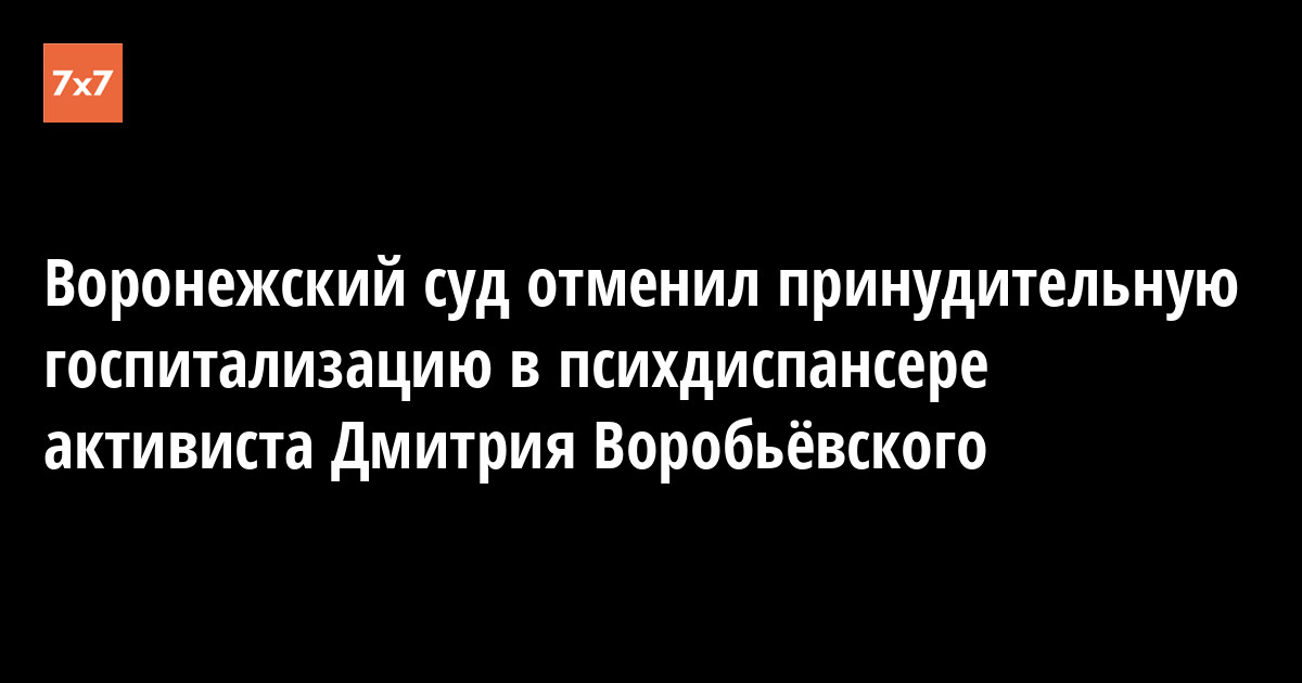 Советский районный суд Воронежа 12 мая отказал в удовлетворении исковых требований областному клиническому психоневрологическому диспансеру, представители которого ходатайствовали о принудительной госпитализации оппозиционера Дмитрия Воробьёвского, — об этом сообщил корреспонденту «7x7» адвокат Воробьёвского Сергей Локтев.