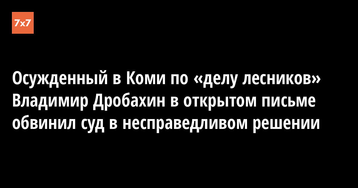 Экс-директор Коми регионального лесопожарного центра Владимир Дробахин, осужденный по «делу Осипова» в марте 2017 года за незаконную вырубку лесов, написал открытое письмо бывшим коллегам, в котором поблагодарил их за поддержку. Обращение представители коллектива центра 16 июня передали редакции «7x7». Самого экс-руководителя Комитета лесов Коми Василия Осипова суд обвинил, в частности, в создании организованной преступной группы для захвата лесохозяйственного рынка республики, в которую якобы входил и Дробахин.