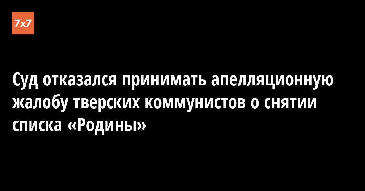Московский районный суд Твери 11 сентября отказался принимать апелляционную жалобу коммунистов, в которой они просили снять с выборов в тверскую гордуму партию «Родина». Об этом «7x7» рассказал источник в «Родине».