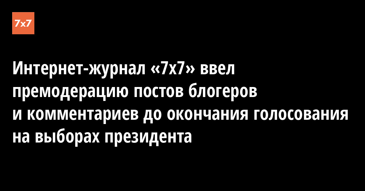 Администрация сайта «7x7» 15 марта ввела премодерацию публикаций блогеров и комментариев, чтобы избежать нарушения выборного законодательства. Эта временная мера будет действовать до 21:00 18 марта, когда на всей территории России завершится голосование по выборам президента.