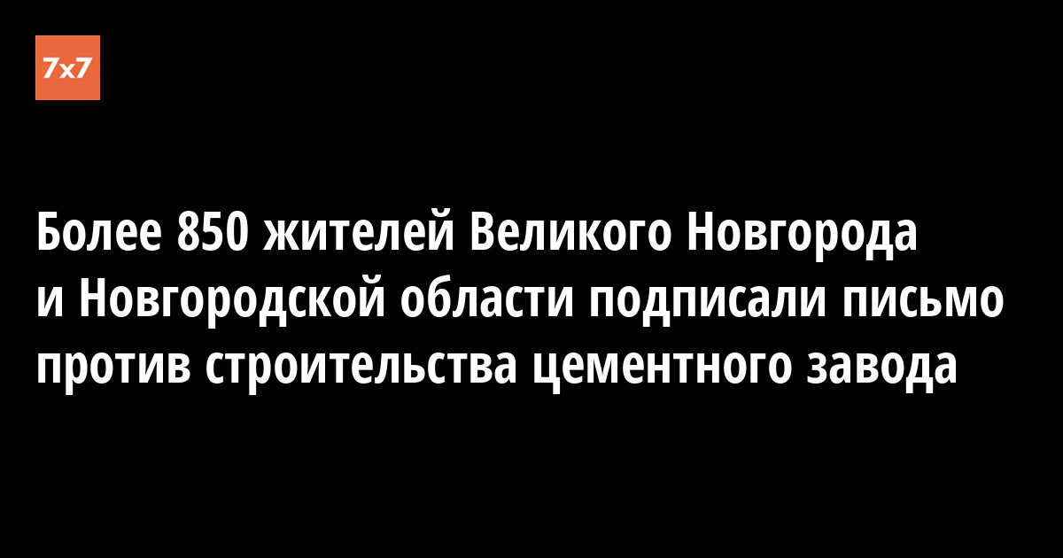 Жители Великого Новгорода и сельских поселений в Новгородском районе отправили губернатору Новгородской области Андрею Никитину и главному федеральному инспектору Вадиму Непряхину письмо с требованием отказаться от идеи строительства цементного завода. Его подписал 851 житель Великого Новгорода, Трубичино, Кречевиц, Чечулина, Стрелки и других поселений. Копию этого письма 12 апреля передали корреспонденту «7x7».