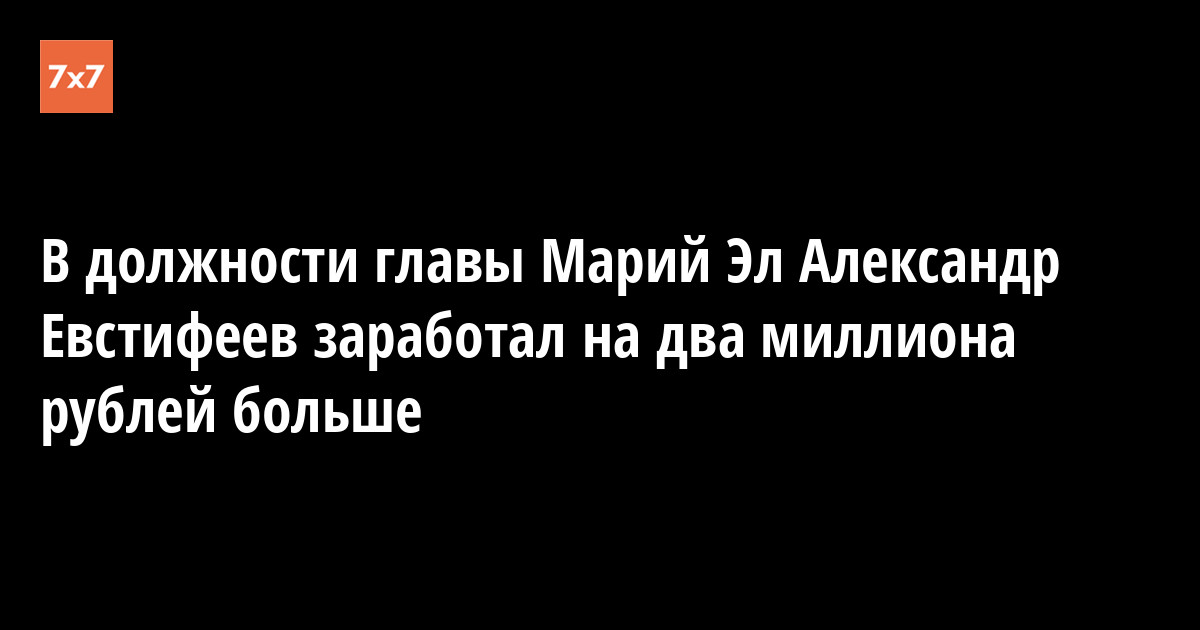 Евстифеев заработал за год 6,16 млн руб., его супруга — 540 тыс. руб. Имущество, которым владеет губернатор Марий Эл, — это земельный участок площадью 2,3 тыс. м2, жилой дом на 340 м2, квартира на 130 м2 и автомобиль Mercedes S500. У его жены есть два участка земли площадью 115 тыс. м2 в сумме и квартира площадью 230 м2.
