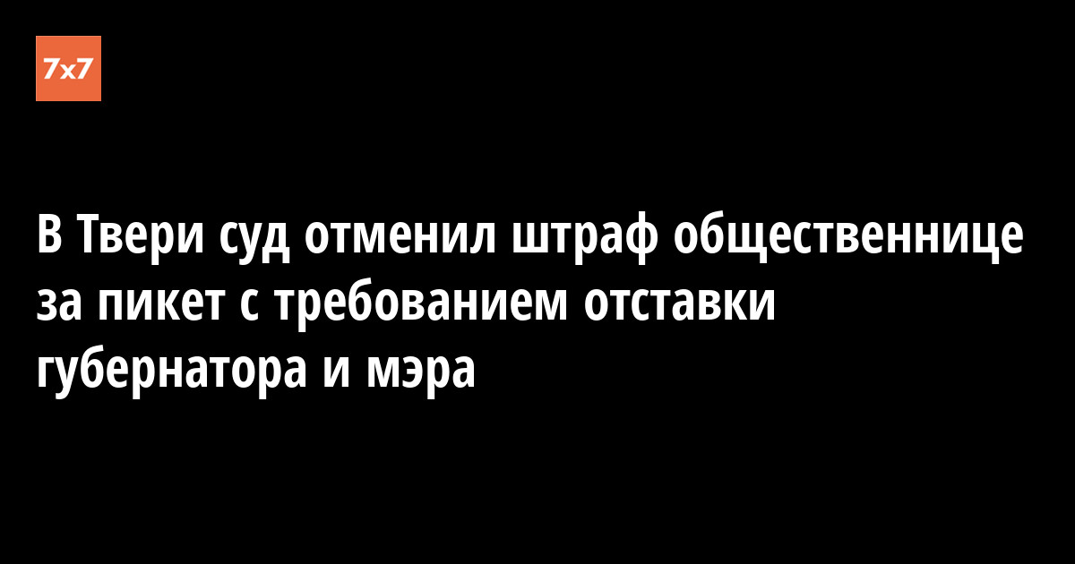 Тверской областной суд 12 сентября отменил штраф Татьяне Джинчвеладзе, назначенный ей за пикет с требованием отставки губернатора Игоря Рудени, мэра Твери Алексея Огонькова и председателя регионального комитета по физической культуре и спорту Андрея Решетова. Об этом активистка написала на своей странице в Fаcebook.