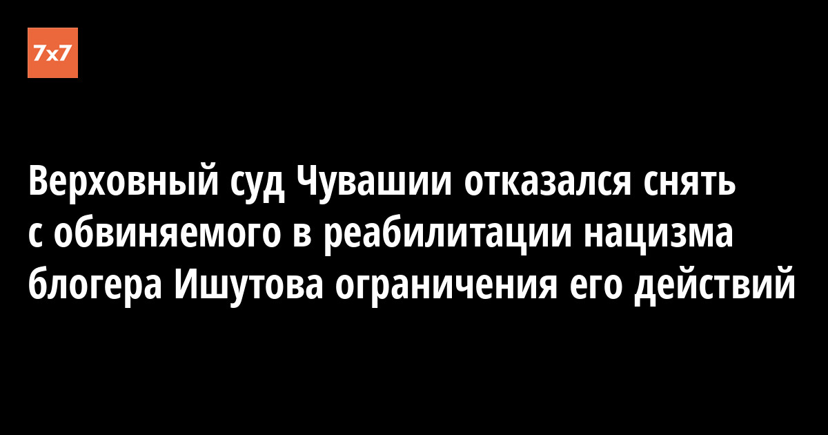 Верховный суд Чувашской Республики 18 октября рассмотрел апелляцию Константина Ишутова по мере пресечения, которую 8 октября установил Московский районный суд Чебоксар. Обвиняемый в реабилитации нацизма требовал отменить наложенные на него ограничения определенных действий. Об этом корреспонденту «7x7» сообщил адвокат обвиняемого Юрий Иванов из зала суда.