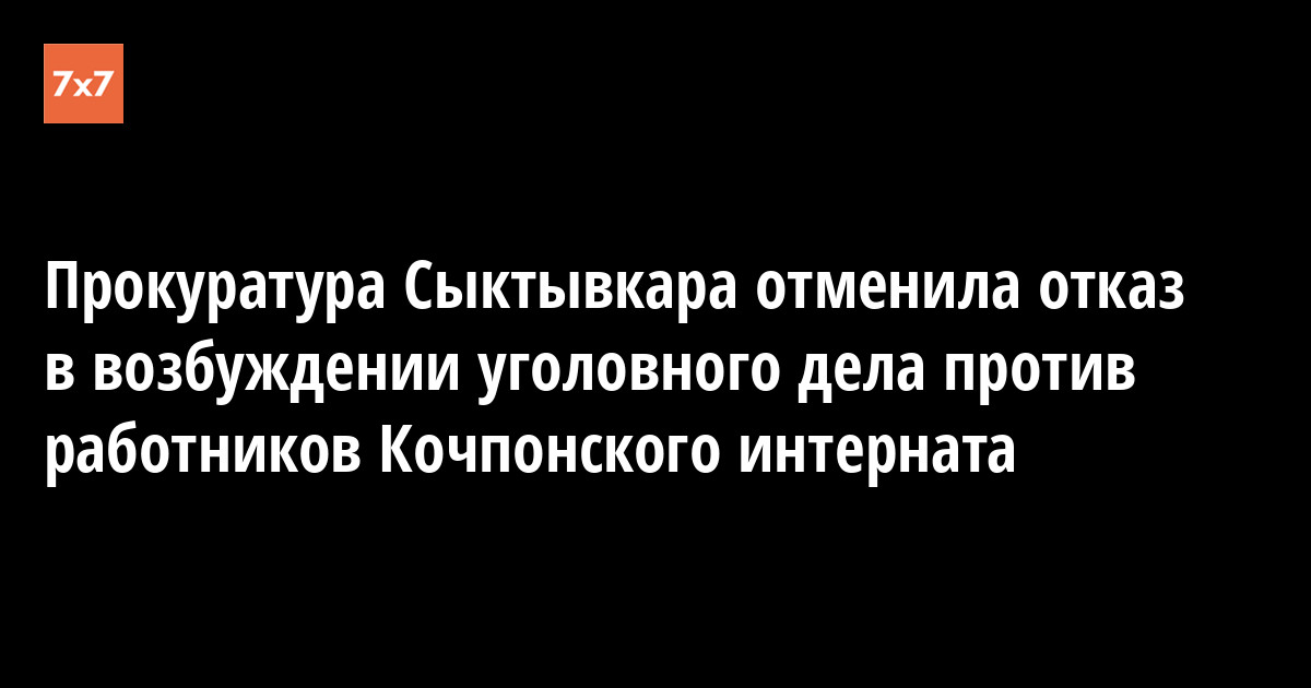Прокуратура Сыктывкара отменила постановление управления МВД города об отказе в возбуждении уголовного дела об оставлении в опасности по результатам проверки Кочпонского психоневрологического интерната. Надзорное ведомство посчитало, что полицейские не опросили всех заинтересованных лиц, говорится в ответе от 31 октября на запрос «7х7». УМВД должно провести дополнительную проверку по заявлению руководителя республиканской общественной организации родителей детей с особенностями развития «Особое детство» Юлии Посевкиной.