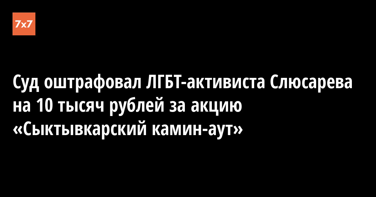 Судья Сыктывкарского городского суда Владимир Краснов 12 ноября оштрафовал ЛГБТ-активиста Вячеслава Слюсарева на 10 тыс. руб. за организацию и проведение акции «Сыктывкарский камин-аут», которая состоялась 11 октября. Мероприятие не было согласовано мэрией, но Слюсарев настаивал, что закон он не нарушал. Об этом сообщил корреспондент «7x7», который был на заседании суда.