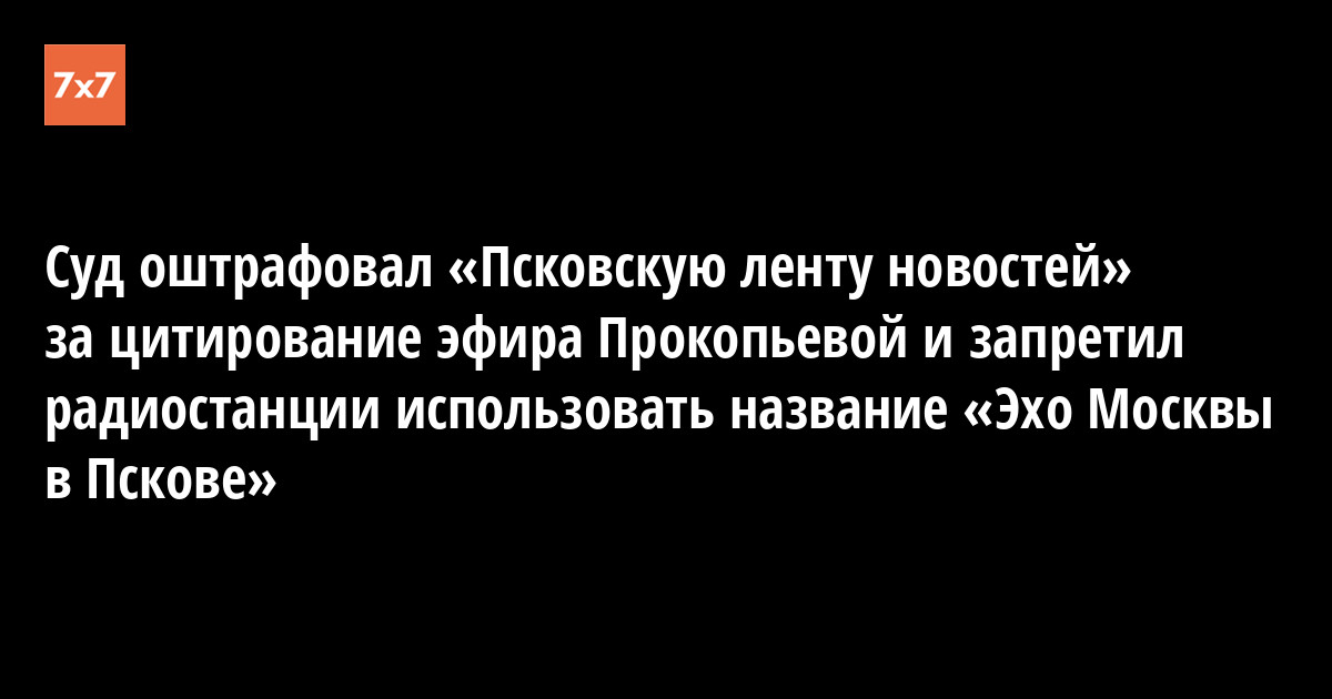 Суд оштрафовал издание «Псковская лента новостей» 7 февраля на 200 тыс. руб. за публикацию текстовой версии радиопрограммы «Минутка просветления» Светланы Прокопьевой от 6 ноября 2018 года, в которой Роскомнадзор усмотрел оправдание терроризма. Об этом «7x7» 8 февраля рассказал главный редактор радиостанции «Эхо Москвы в Пскове» («Радиоканал 60FM») Максим Костиков.