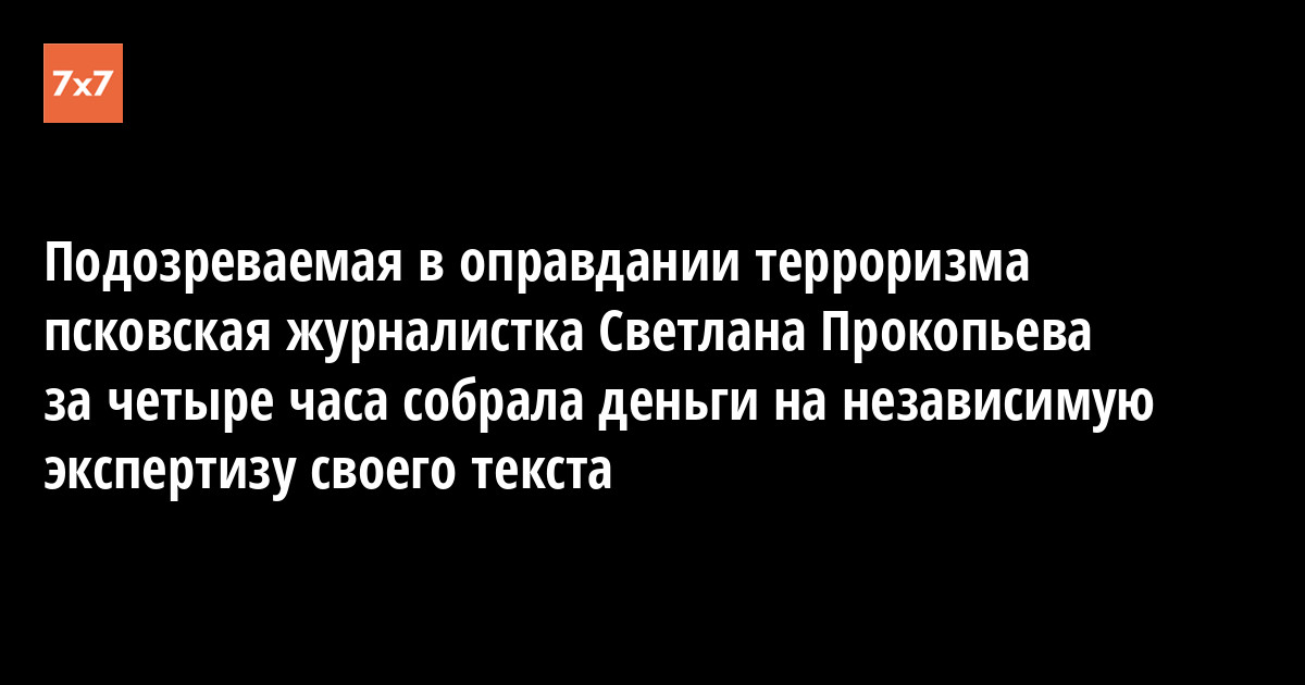 Псковская журналистка Светлана Прокопьева, которую подозревают по статье 205.2 Уголовного кодекса России («Публичные призывы к осуществлению террористической деятельности или публичное оправдание терроризма») собрала деньги на независимую лингвистическую экспертизу текста «Репрессии для государства». Деньги (260 тыс. руб.) удалось собрать в течение четырех часов — об этом она сообщила корреспонденту «7x7» 18 февраля.
