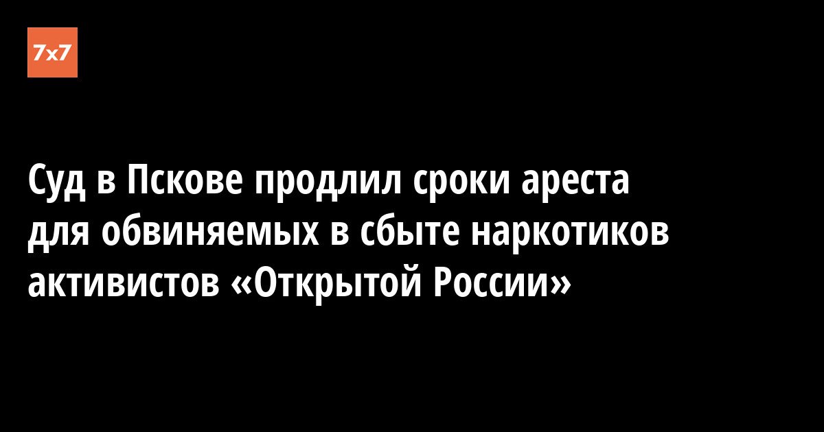 Псковский городской суд 13 марта продлил меры пресечения обвиняемым в сбыте наркотиков координатору псковской «Открытой России» Лии Милушкиной и ее мужу Артёму Милушкину. Об этом сообщил корреспондент «7x7» из зала суда.