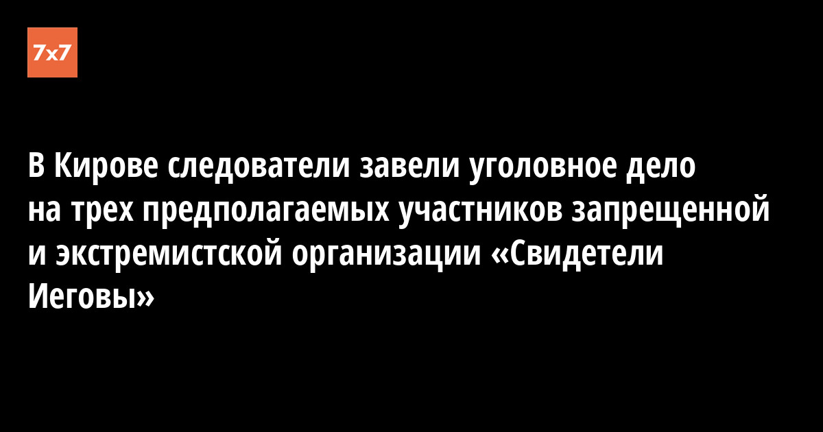 Управление Следственного комитета по Кировской области возбудило уголовное дело о создании эстремистской и запрещенной в России организации «Свидетели Иеговы». Фигурантами дела являются три человека. Об этом «7x7» 27 марта сообщила пресс-секретарь управления СК по региону Мария Меркулова.