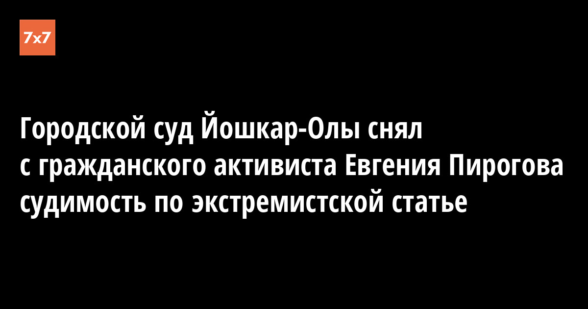 Йошкар-Олинский городской суд 3 апреля частично удовлетворил ходатайство гражданского активиста Евгения Пирогова о пересмотре приговора от 29 апреля 2016 года по статье об экстремизме. Суд не нашел оснований для его отмены, но снял судимость, сообщил Пирогов корреспонденту «7х7».