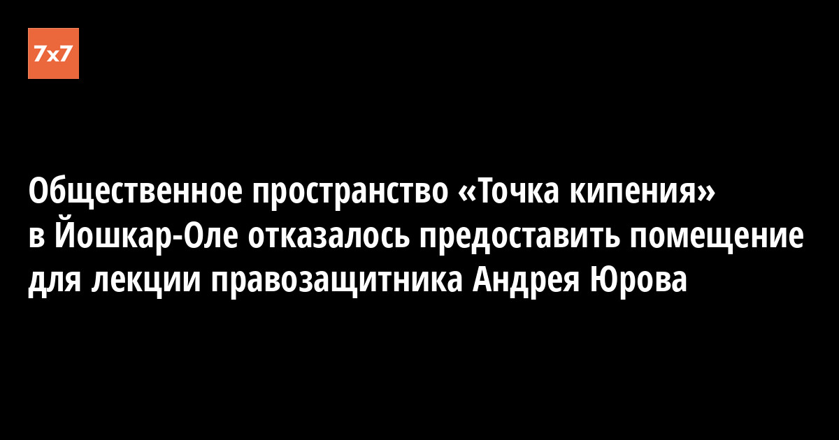 Общественное пространство «Точка кипения» в Йошкар-Оле отказалось предоставить помещение для запланированной на 4 апреля лекции «Права человека и гражданское общество в России», которую должен был прочесть международный правозащитник, философ, литератор, соавтор концепции «гуманитарного антифашизма» Андрей Юров. Об этом на своей странице в Facebook сообщила координатор межрегиональной общественной организации «Человек и закон» Ольга Васильева.