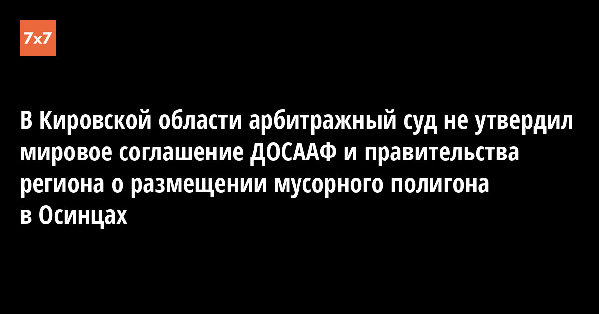 Второй арбитражный апелляционный суд 3 апреля не утвердил мировое соглашение между правительством Кировской области, мэрией Кирова, администрацией Слободского района,региональным отделением ДОСААФ России и компанией «Центральный полигон» по вопросу выдачи разрешения на строительство полигона ТБО в Осинцах. По мнению суда, положения соглашения противоречат действующим законам, сообщил корреспондент «7x7».