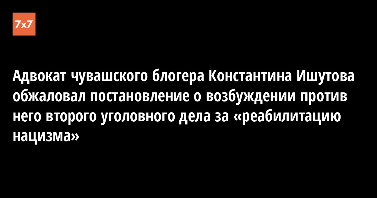 Защитник чебоксарского блогера Константина Ишутова 10 апреля обжаловал постановление следственного управления о возбуждении второго уголовного дела по статье 354.1 Уголовного кодекса РФ («Реабилитация нацизма»). Об этом «7х7» сообщил адвокат от правозащитной группы «Агора» Юрий Иванов.