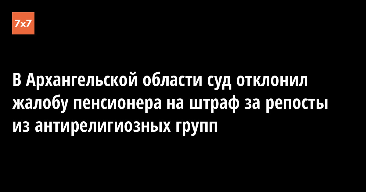 Северодвинский городской суд Архангельской области отклонил жалобу на назначение административного наказания пенсионеру Анатолию Казиханову за репосты из антирелигиозных групп. Эту информацию 17 апреля подтвердил «7x7» адвокат Казиханова Алексей Куроптев.