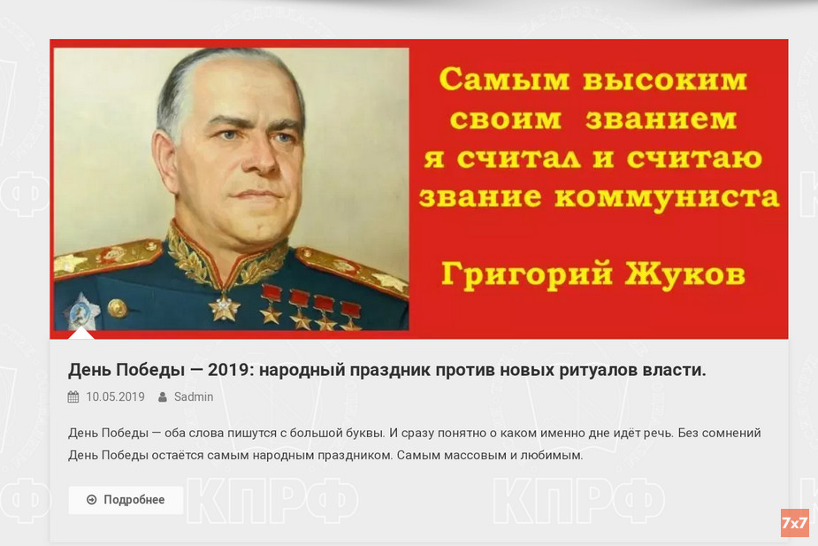 На сайте Ханты-Мансийского регионального отделения КПРФ 10 мая появилась заметка о праздновании Дня Победы с портретом Маршала Советского Союза Георгия Жукова. Полководец на картинке подписан именем Григорий. Автор публикации с множеством пунктуационных ошибок констатирует, что «праздник из общенародного и надклассового все больше превращается в торжественный ритуал буржуазной власти, обращающейся с трибун к своим верноподданным по поводу неких событий, произошедших в Берлине в 1945 году».