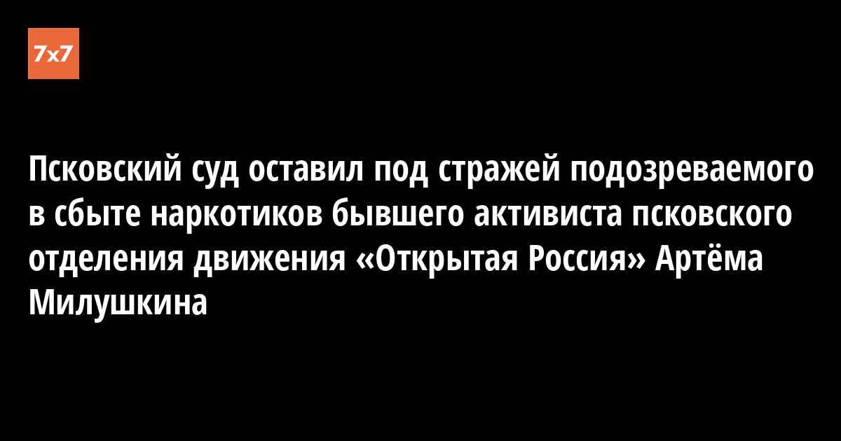 Псковский городской суд 14 мая оставил под стражей подозреваемого в распространении наркотиков бывшего активиста регионального отделения движения «Открытая Россия» Артёма Милушкина. Он останется в СИЗО до 15 июля, сообщил корреспондент «7x7».