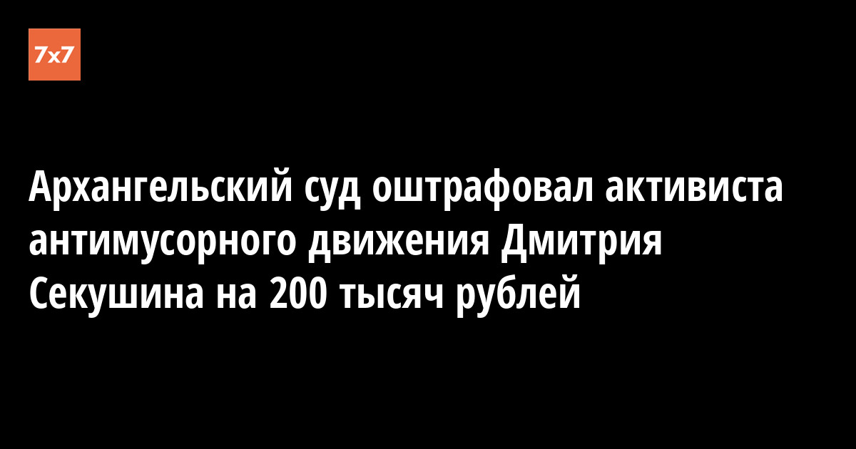 Октябрьский районный суд Архангельска 28 мая оштрафовал экоактивиста Дмитрия Секушина на 200 тыс. руб. по части 8 статьи 20.2 Кодекса об административных правонарушениях («Повторное нарушение порядка организации либо проведения собрания, митинга, демонстрации, шествия или пикетирования»). Об этом Секушин сообщил «7x7».