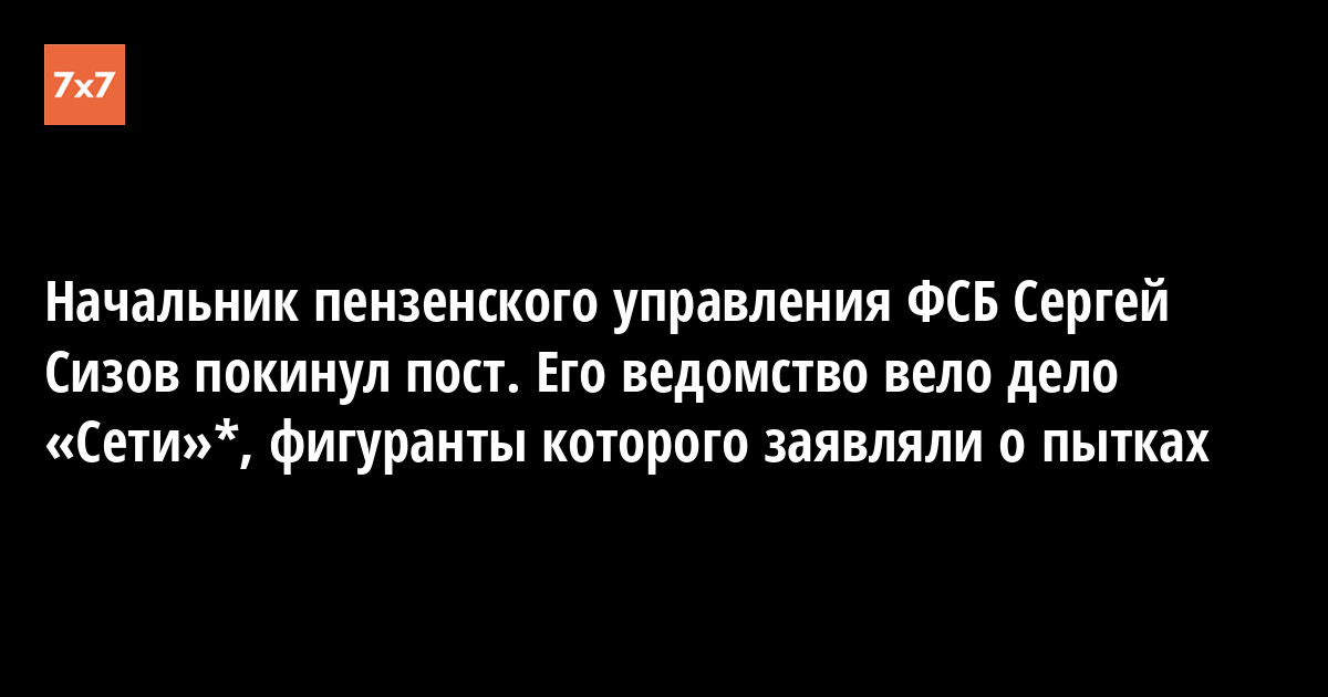 Начальник управления ФСБ России по Пензенской области Сергей Сизов ушел с поста, он переходит на аналогичную должность в Челябинске. Об этом стало известно 29 мая во время рабочей встречи Сергея Сизова с губернатором Пензенской области Иваном Белозерцевым. Ведомство Сизова вело расследование дела о создании террористического сообщества «Сеть»*, фигуранты которого заявляли о пытках.