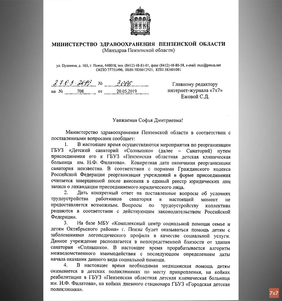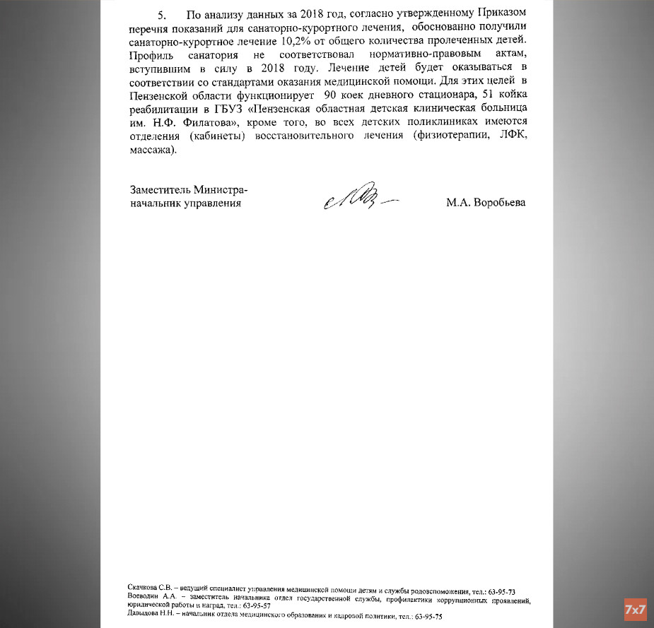 В официальном ответе на запрос "7х7" от 27 мая замминистра здравоохранения Пензенской области Марина Воробьева написала, что в 2018 году только 10,2% детей получили санаторно-курортное лечение в «Солнышке» обоснованно. Она сослалась на аналитические данные Минздрава и несоответствие профиля санатория новым нормативным актам, о чем "7х7" уже писал.