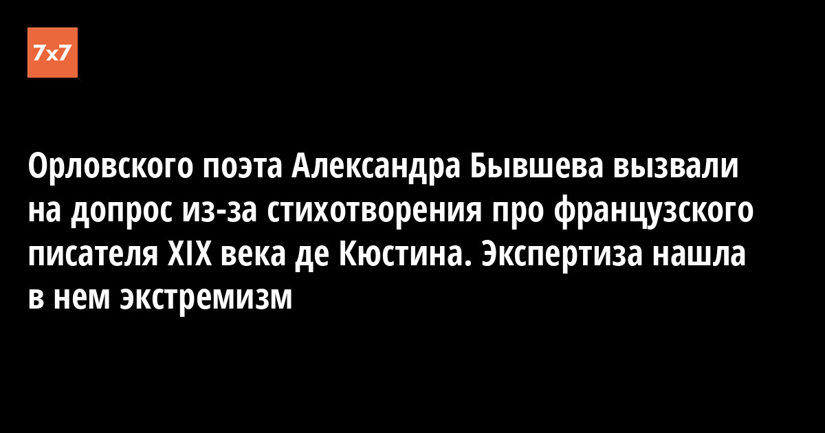 Жителя поселка Кромы поэта Александра Бывшева вызвали на допрос в Кромской межрайонный следственный отдел следственного управления СК России по Орловской области по пятому делу об экстремизме. Эту информацию «7x7» сообщил адвокат Бывшева Владимир Сучков.