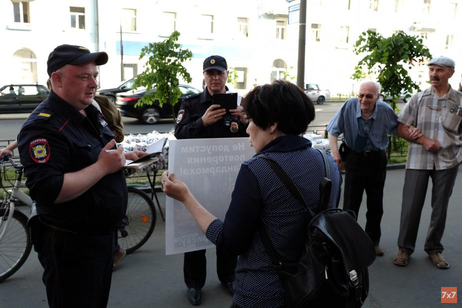 Время от времени к пикетчикам подходили полицейские. Они фотографировали участников акции и проверяли у них документы. По проспекту Ленина ездили два наряда полиции и одна патрульная машина ДПС.