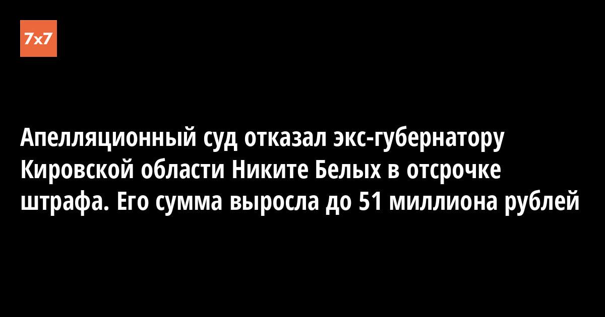 Московский городской суд отказал в апелляции на решение Пресненского суда Москвы бывшему губернатору Никите Белых в отсрочке уплаты штрафа. Об этом 24 июня сообщило агентство White.press, связанное с женой Белых Екатериной.