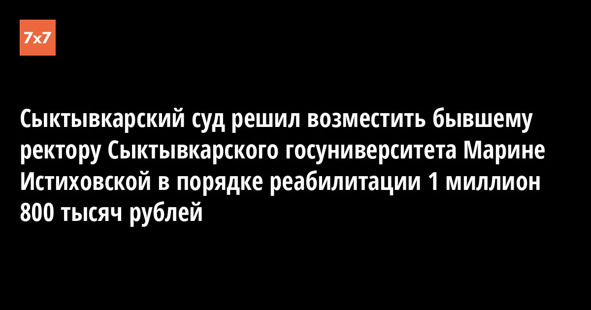 Городской суд Сыктывкара 25 июня частично удовлетворил иск о реабилитации бывшего ректора Сыктывкарского госуниверситета Марины Истиховской. Экс-ректору СГУ возместят 1 млн 800 тыс. рублей. В сумму входят затраты на адвоката и компенсация материального ущерба. Об этом корреспонденту «7х7» сообщил секретарь суда, информацию подтвердил бывший адвокат Истиховской Данил Шицов.