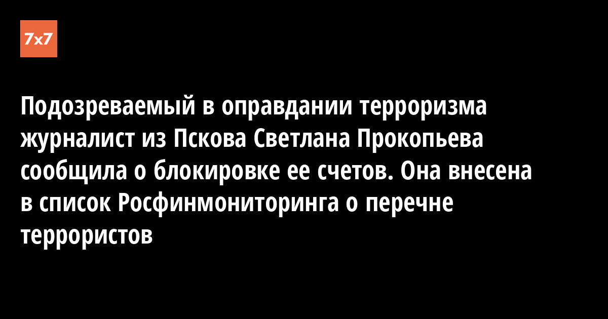Журналист из Пскова Светлана Прокопьева, которую обвиняют в оправдании терроризма, сообщила, что ее банковские счета заблокированы. Об этом она написала на странице в Facebook 4 июля.