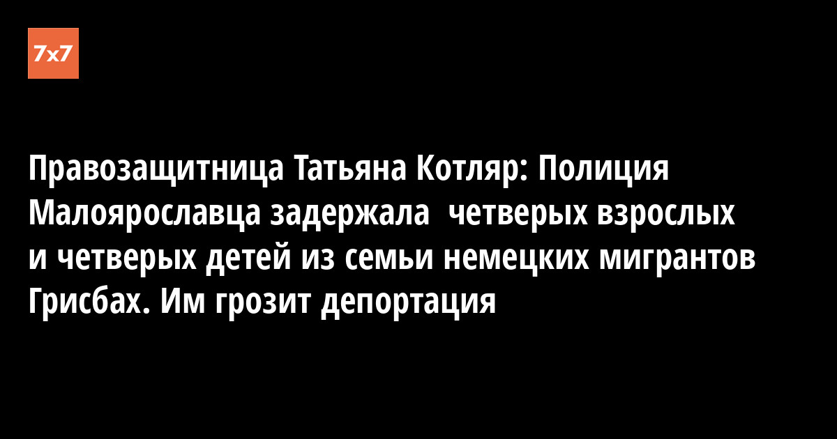 Как сообщила "7х7" обнинская правозащитница Татьяна Котляр, в Малоярославце Калужской области полиция доставила в отделение миграционной службы города Малоярославца восемь человек из семьи мигрантов из Германии Грисбах, среди них четверо детей. По ее словам, это произошло ночью 3 июля. Семья приехала в Россию с просьбой о временном убежище.