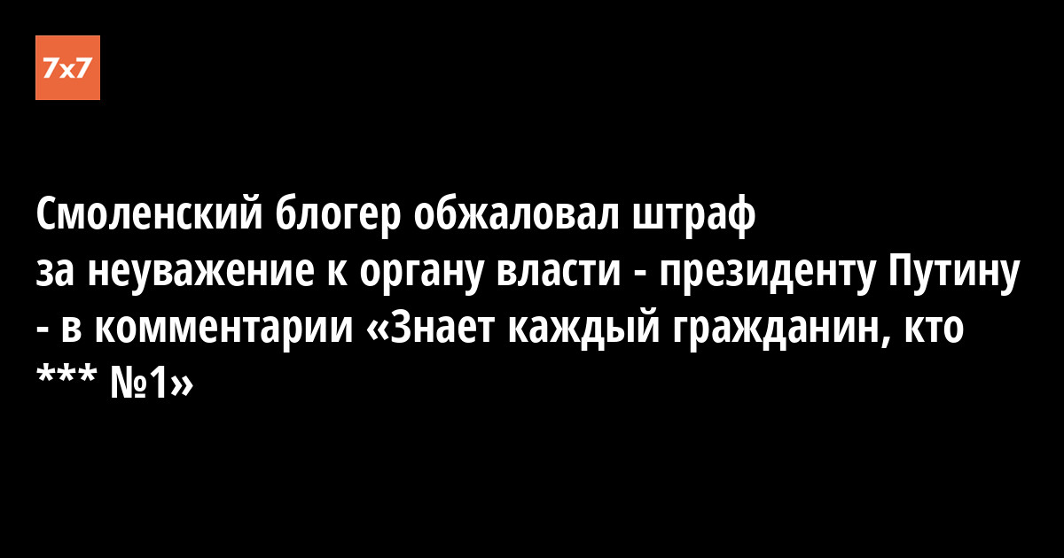 Смоленский блогер Сергей Командиров обжаловал постановление Ленинского районного суда о штрафе в 30 тыс. руб. за комментарий в соцсети «ВКонтакте». Его оштрафовали за фразу «Знает каждый гражданин, кто **** №1» и фотографию Владимира Путина в комментариях под новостью о первом применении закона «о неуважении к власти» сенатора Андрея Клишаса. Об обжаловании постановления 8 июля сообщило издание «МБХ Медиа».