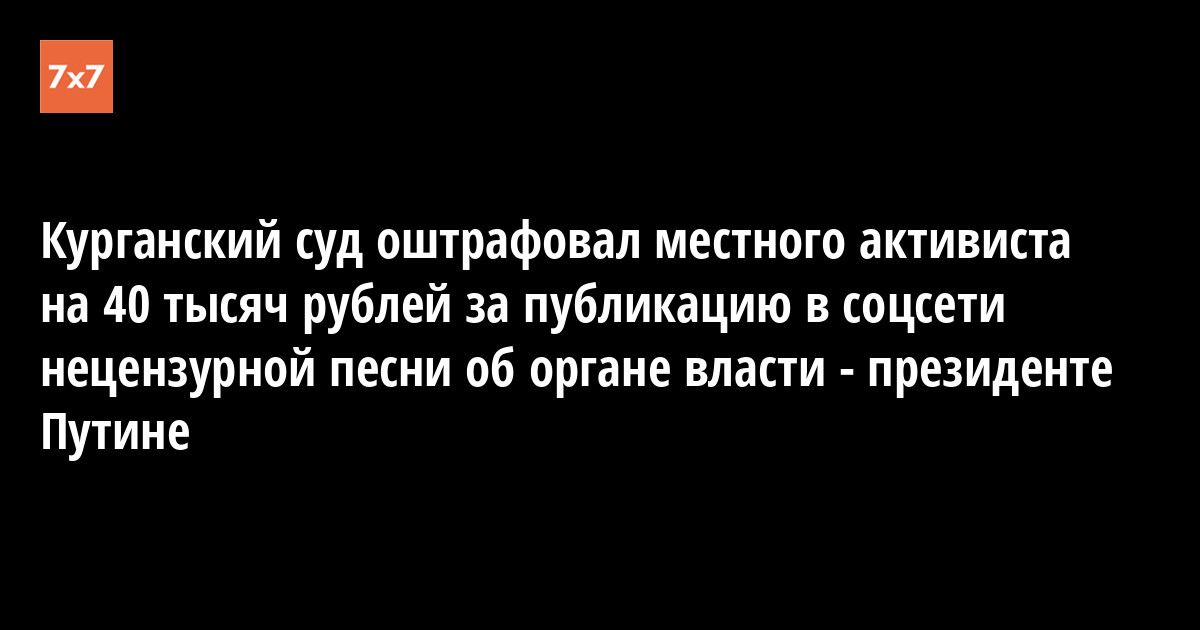 Курганский городской суд оштрафовал на 40 тыс. руб. активиста движения «Агит Россия» Евгения Жукова за то, что он разместил в соцсети «ВКонтакте» нецензурную песню про орган власти - президента Владимира Путина. Об этом 19 августа сообщил в своем Telegram-канале правозащитник Павел Чиков.