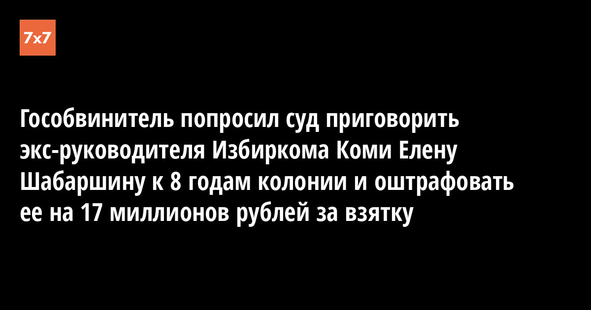 На судебном заседании в Сыктывкарском городском суде 23 августа государственный обвинитель попросил признать экс-председателя Избирательной комиссии Коми Елену Шабаршину виновной в получении взятки, назначить ей 8 лет колонии общего режима и оштрафовать на 17,1 млн руб., сообщил из зала суда корреспондент «7x7».