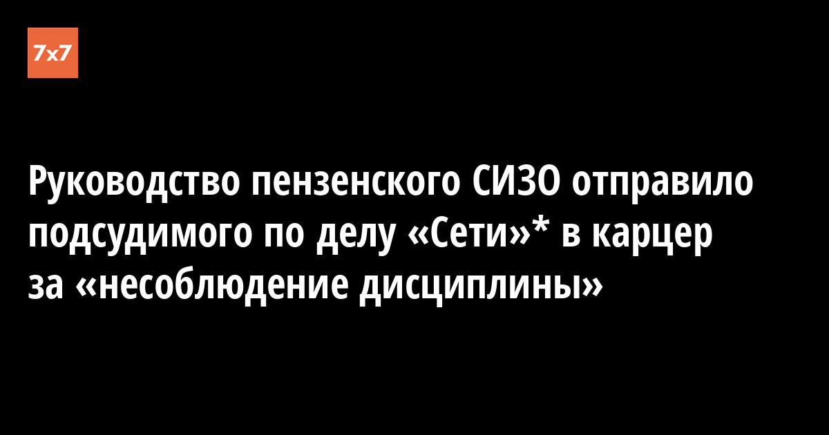 Руководство пензенского СИЗО отправило обвиняемого по «пензенскому делу» о террористическом сообществе «Сеть»* Михаила Кулькова в карцер следственного изолятора до 2 сентября. Об этом 28 августа рассказала «7х7» мать Кулькова Елена Самонина.