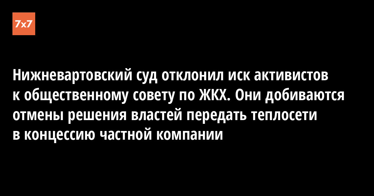 Нижневартовский городской суд 29 августа отклонил иск инициативной группы горожан к Общественному совету по ЖКХ. Активисты пытались оспорить протокол заседания общественного совета, который рассматривал вопрос о повышении коммунальных тарифов при передаче теплосетей в концессию частной компании. За судебным заседанием наблюдал корреспондент "7х7".