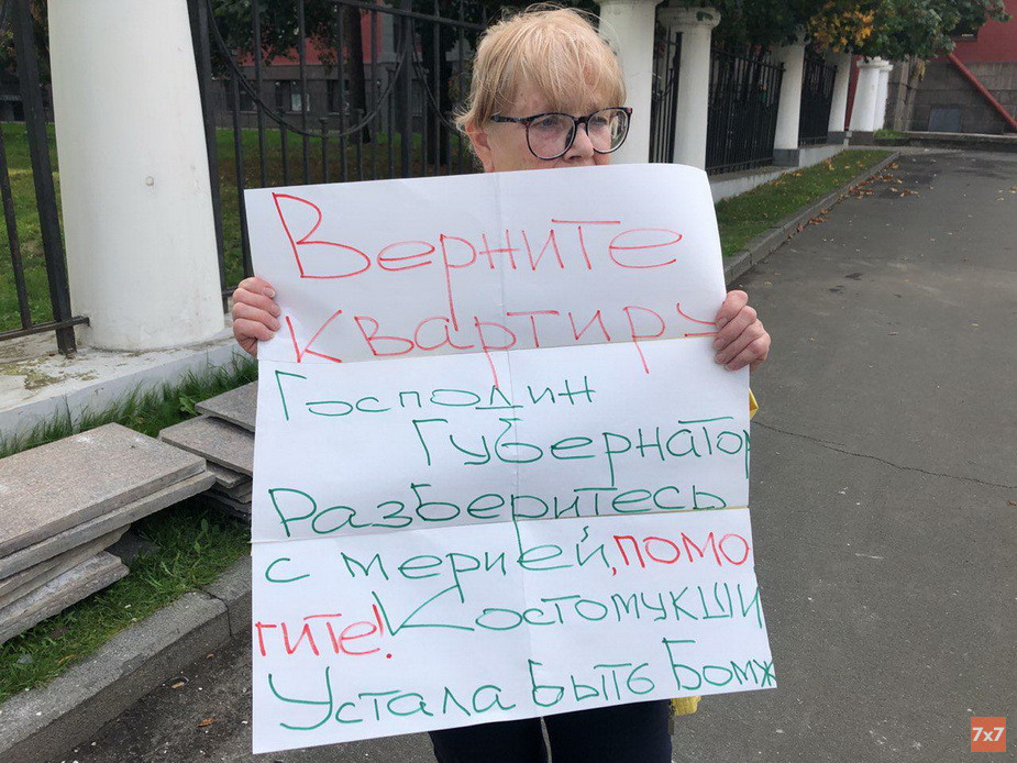 В Петрозаводске пенсионерка Лариса Куликова вышла с одиночным пикетом к зданию правительства Карелии 11 сентября. Она сделала это в шестой раз. В руках она держала лист бумаги со словами: «Верните квартиру. Господин губернатор, разберитесь с мэрией Костомукши, устала быть бомжом», - сообщил корреспондент "7х7".