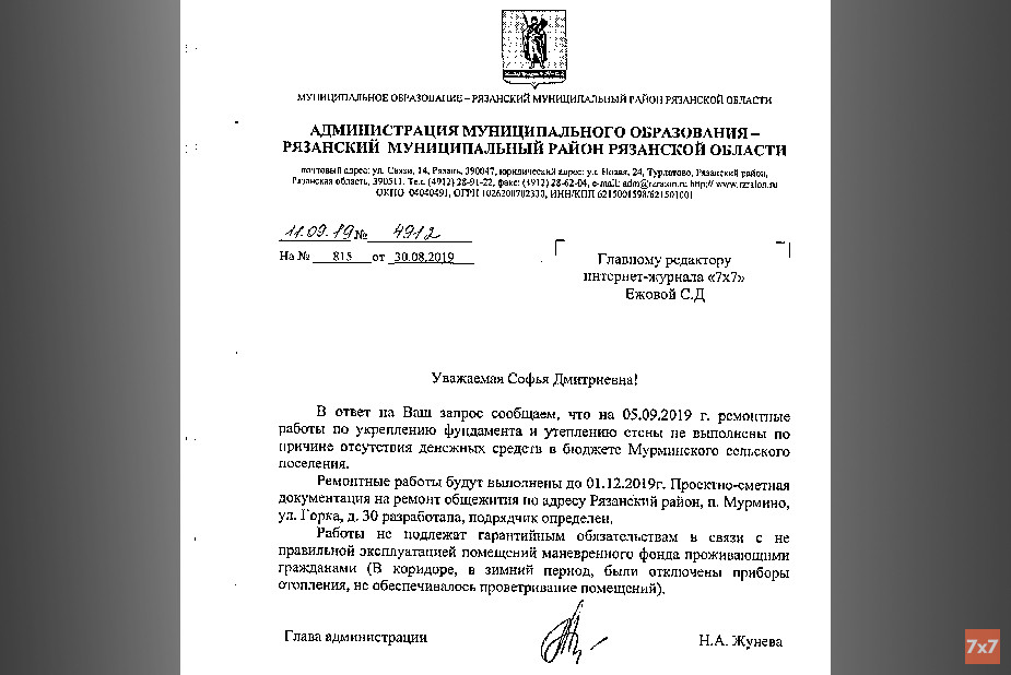 В ответ на запрос «7x7» о сроках выполнения обещанных ремонтных работ Жунёва сообщила, что денег на это в бюджете Мурминского сельского поселения нет. Пока разработана проектно-сметная документация на работы по укреплению фундамента и утеплению стен в жилых комнатах, определен подрядчик. Глава района вновь пообещала отремонтировать общежитие к 1 декабря 2019 года.