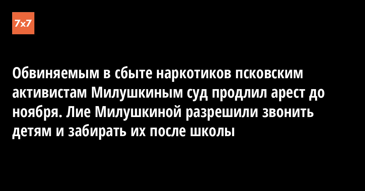 Псковский горсуд 12 сентября продлил на два месяца арест обвиняемым в сбыте наркотиков в крупном размере псковским активистам ликвидированного движения «Открытая Россия» супругам Милушкиным. Лия останется под домашним арестом, Артем - в следственном изоляторе. Об этом корреспонденту «7х7» сообщили их адвокаты.
