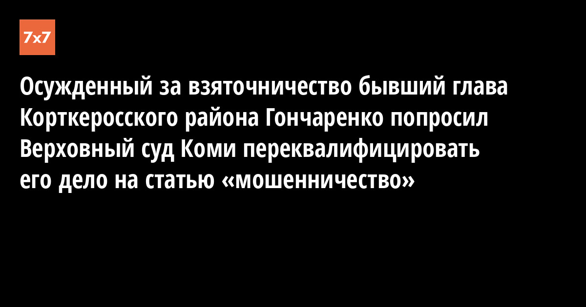 Бывший глава Корткеросского района Коми Василий Гончаренко попросил Верховный суд республики признать его не взяточником, а мошенником. В этом суть его жалобы на решение Сыктывкарского суда, который в июле 2018 года приговорил его к 7 годам лишения свободы в колонии строгого режима за получение взятки. На заседании Верховного суда побывал корреспондент «7х7».