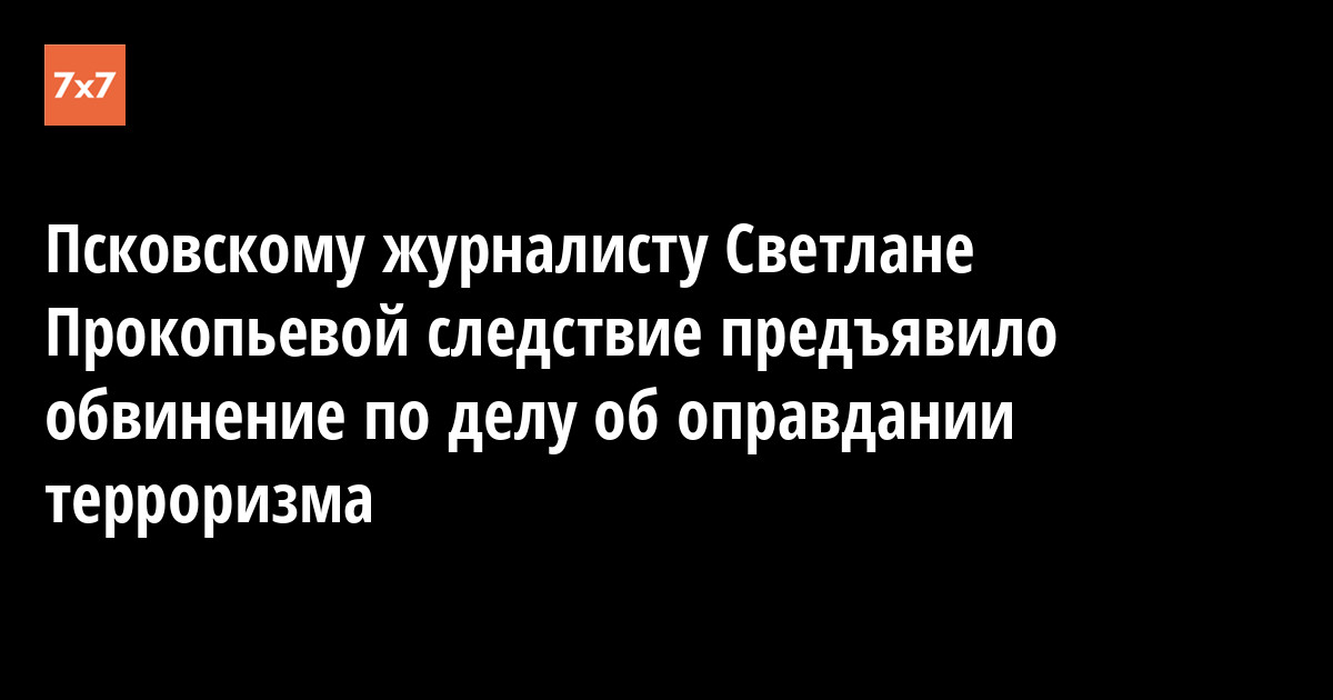 Следственное управление Следственного комитета по Псковской области предъявило журналисту Светлане Прокопьевой обвинение по части 2 статьи 205.2 Уголовного кодекса РФ ("Публичные призывы к осуществлению террористической деятельности, публичное оправдание терроризма или пропаганда терроризма"). Об этом она сообщила 20 сентября корреспонденту «7×7».
