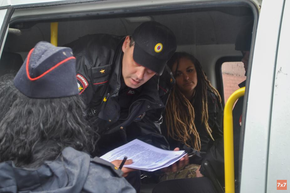 Перед митингом полицейские задержали еще одну активистку, Юлию Чапурину: она стояла у рамок и считала пришедших, ей тоже вменяют в вину участие в несогласованном шествии 7 апреля.