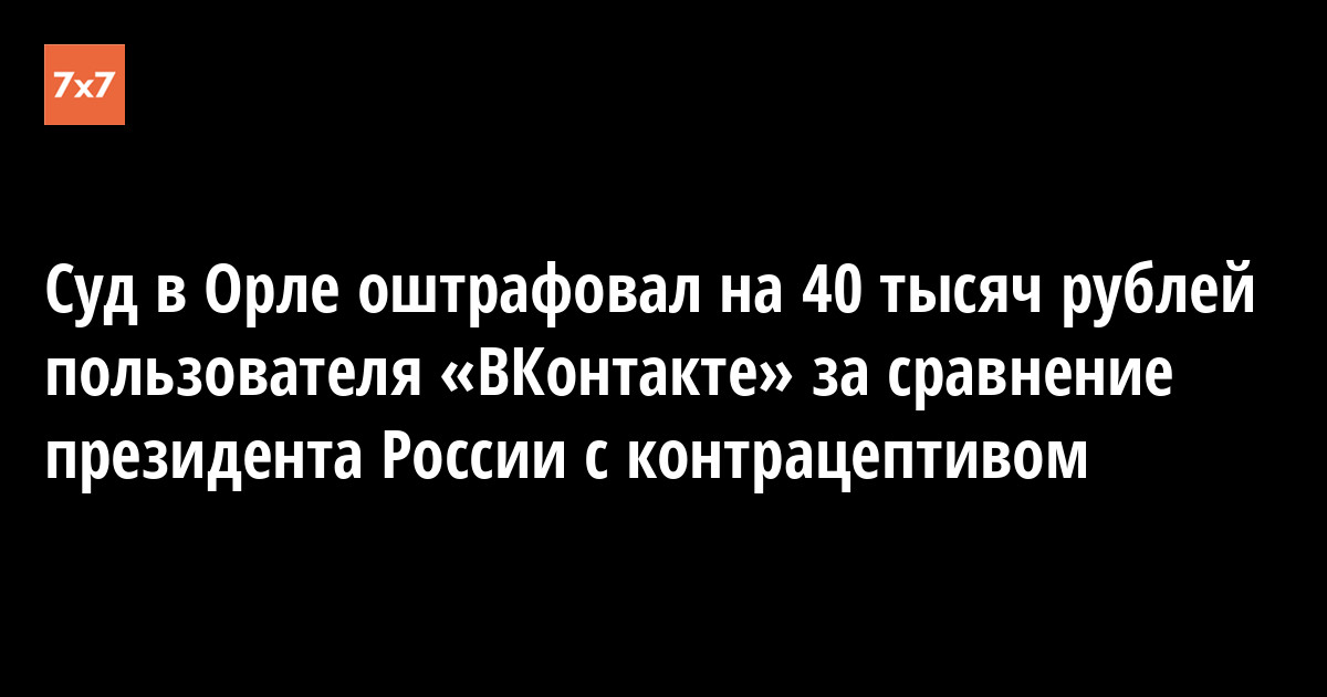 Железнодорожный районный суд Орла оштрафовал на 40 тыс. руб. местного жителя Андрея Бычкова по закону "о неуважении власти" за грубое сравнение органа власти - президента Владимира Путина - с контрацептивом. Об этом 24 сентября сообщила «7х7» активист движения «Время» Александра Тарусова.