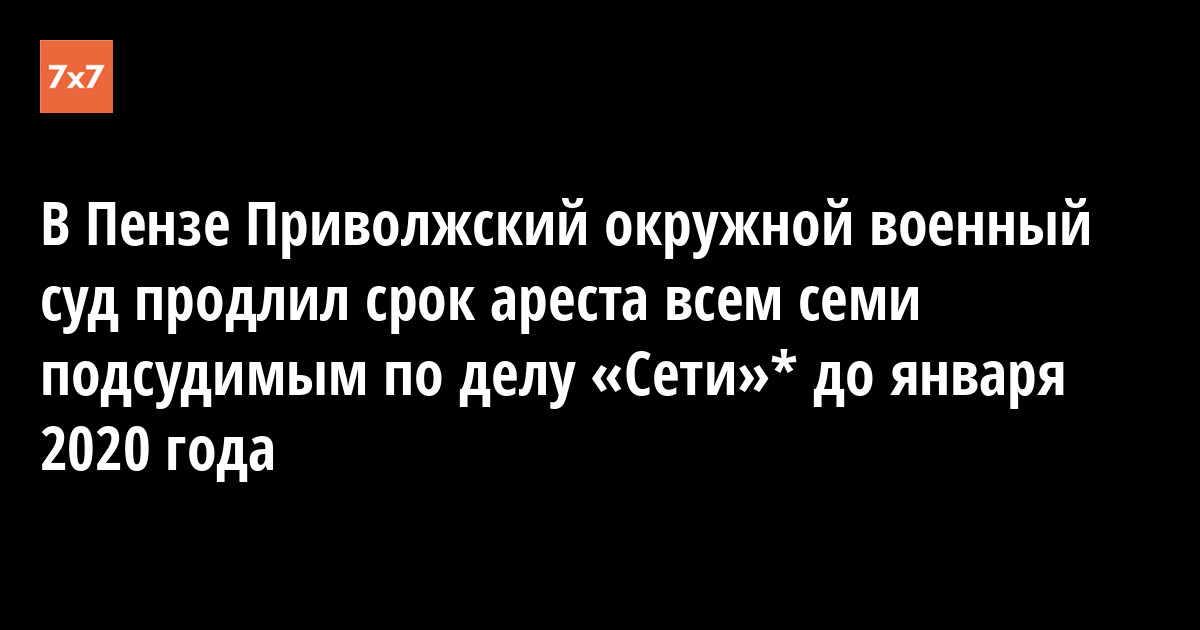 Приволжский окружной военный суд продлил срок содержания под стражей до 3 января 2020 года семи подсудимым «пензенского дела» — Илье Шакурскому, Василию Куксову, Дмитрию Пчелинцеву, Андрею Чернову, Арману Сагынбаеву, Михаилу Кулькову и Максиму Иванкину, — сообщили «7х7» адвокаты из зала суда.