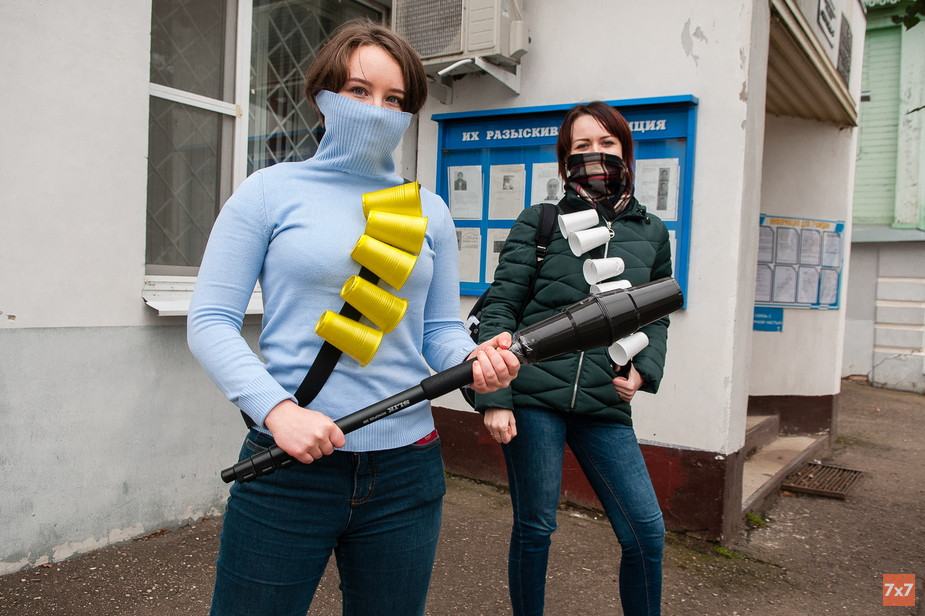 У отделения полиции девушки устроили фотосессию со стилизованными патронташными лентами и «гранатометом» из пластиковых стаканчиков (одним из поводов для возбуждения уголовных дел против участников акции 27 июля в Москве стал бросок в сторону полицейских одноразового стаканчика), а у общественной приемной председателя партии «Единая Россия» Дмитрия Медведева организовали флешмоб в футболках с кровавыми подтеками, заклеенными красным скотчем ртами и наручниками. Одна из участниц держала плакат «Она была против Путина».